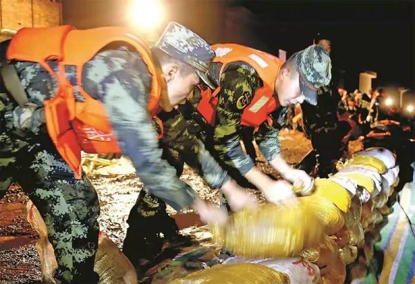 汾河新絳段抗洪一線,武警官兵在抓緊加筑堤壩。
